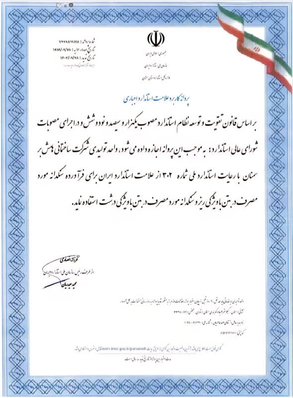 مجوز ها و استانداردها :دارای پروانه بهره برداری و گواهی هایمعتبر ملی برای اطمینان از کیفیت و ایمنی .